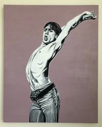 Acrylic paintings include realistic black and white painted detailed subject with a solid colored background. The effect is modern with an element of a rock and roll show poster.